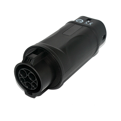 T1 Dişi (Araba) - T2 Erkek (Kablo) Kompakt Adaptör, Tip 1 (T1) şarj fişi (dişi uç) kullanan bir elektrikli araç (EV) ile bir şarj kablosu arasındaki bağlantıyı kolaylaştırmak için tasarlanmış bir adaptördür. Tip 2 (T2) fiş (erkek uç).